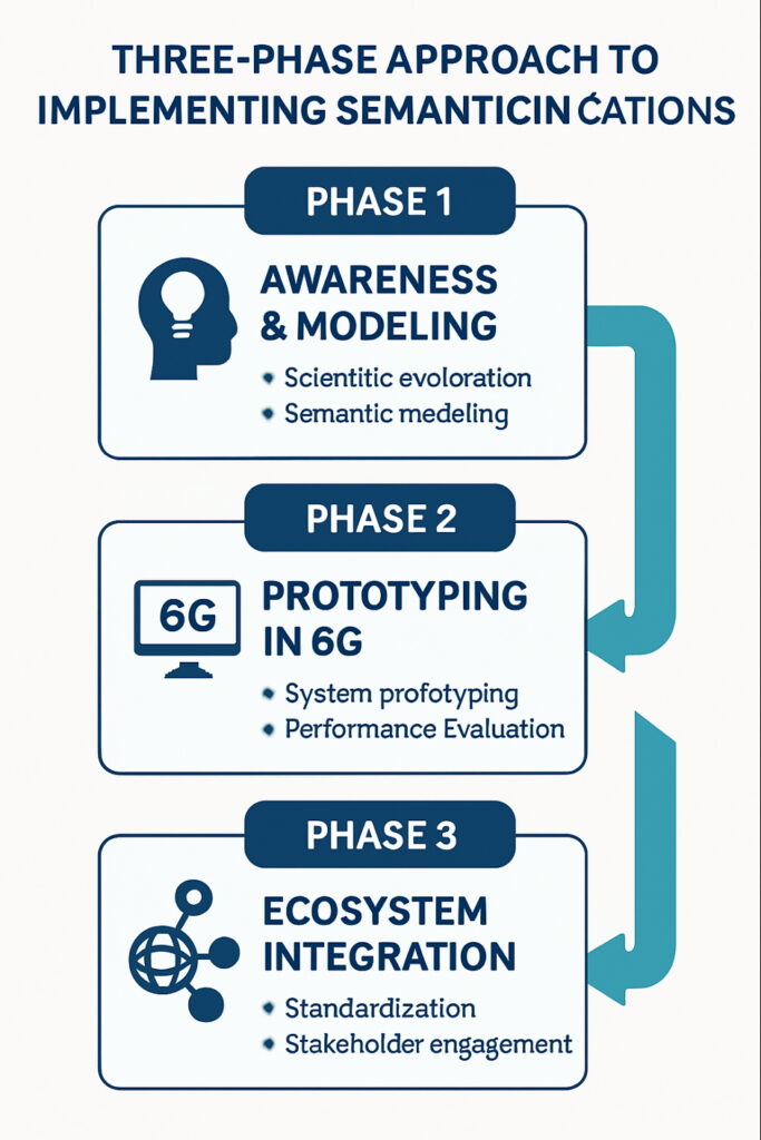 The second phase, Prototyping in 6G Environments, involves integrating semantic communication with URLLC and mMTC (massive Machine Type Communications). We should test these integrations with Digital Twin networks and edge AI, while simultaneously establishing pre-standardization working groups to ensure alignment across the industry.